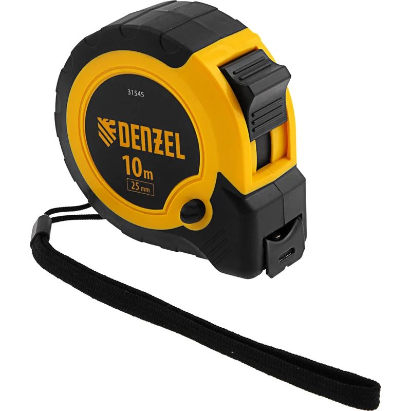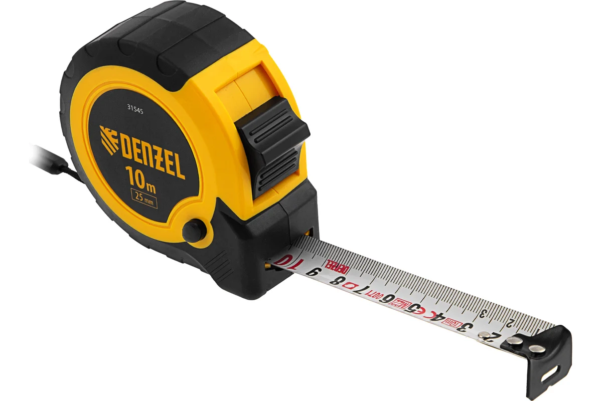 Рулетка Denzel 31545 в двухкомпонентном корпусе, с кнопкой-паузой, с полотном шириной 25 мм и длиной 10 м, используется для измерения расстояний и размеров предметов. Удобна для работы в труднодоступных местах. Стальная лента с эмалевым покрытием и защитной пластиной в месте крепления зацепа рассчитана на долгий срок службы. Рулетка будет полезна во время строительства и ремонта, а также пригодится в быту.