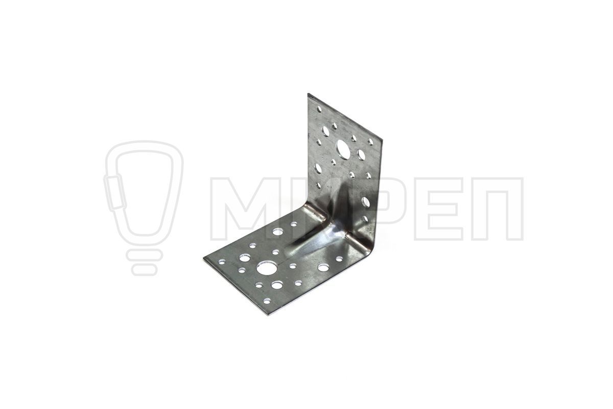 Уголок крепёжный усиленный KUU — металлическая пластина, согнутая под прямым углом. По центру проходит ребро жесткости. На обоих плечах (сторонах уголка) есть отверстия круглой формы.
