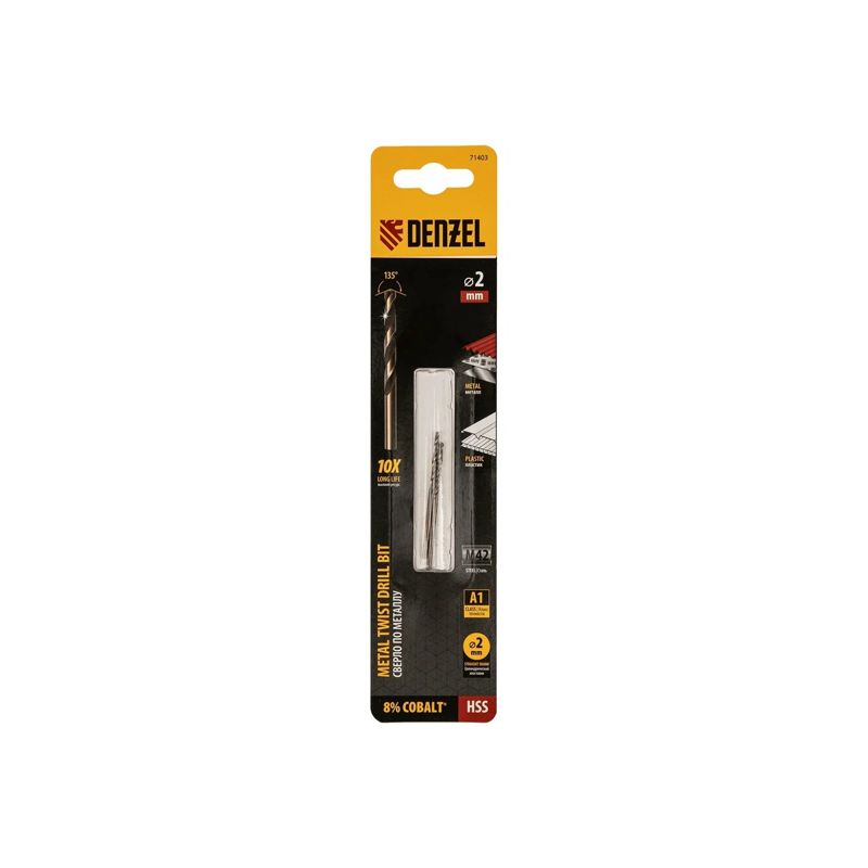 Кобальтовое сверло по металлу Denzel 71403 диаметром 2 мм, из стали HSS Co-8%, 2 шт. в упаковке, позволяет получать отверстия высокой точности в нержавеющей стали, цветных металлах, легированных и нелегированных сталях с пределом прочности до 1100 Н/мм2, а также в жестком пластике. Угол заточки 135° обеспечивает повышенную точность и чистоту сверления.