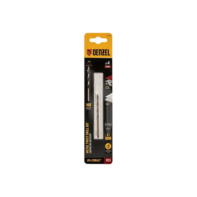 Кобальтовое сверло по металлу Denzel 71427 диаметром 4 мм, из стали HSS Co-8%, позволяет получать отверстия высокой точности в нержавеющей стали, цветных металлах, легированных и нелегированных сталях с пределом прочности до 1100 Н/мм2, а также в жестком пластике. Угол заточки 135° обеспечивает повышенную точность и чистоту сверления.