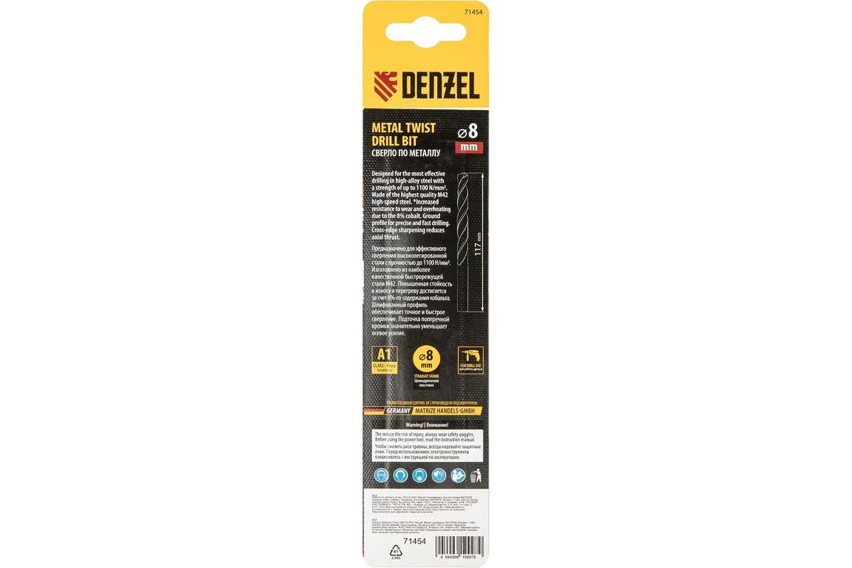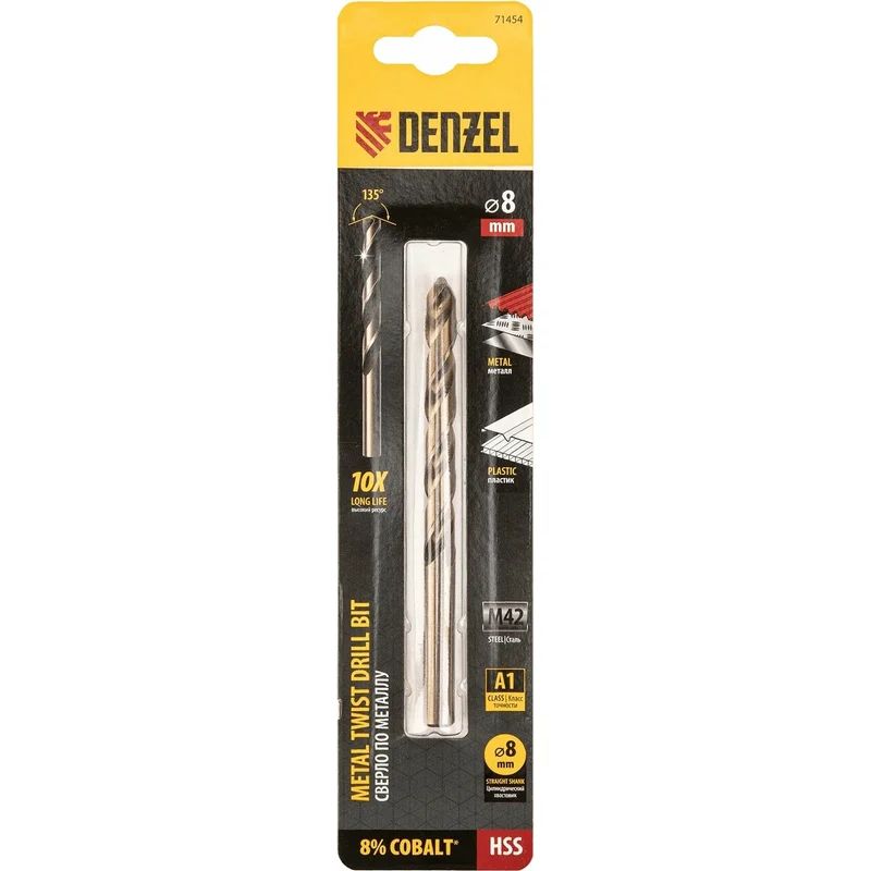 Кобальтовое сверло по металлу Denzel 71454 диаметром 8 мм, из стали HSS Co-8%, позволяет получать отверстия высокой точности в нержавеющей стали, цветных металлах, легированных и нелегированных сталях с пределом прочности до 1100 Н/мм2, а также в жестком пластике. Угол заточки 135° обеспечивает повышенную точность и чистоту сверления.