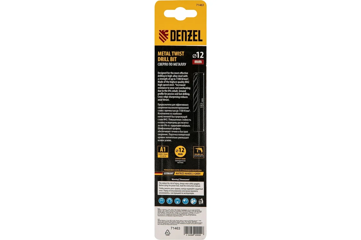 Кобальтовое сверло по металлу Denzel 71463 диаметром 12 мм, из стали HSS Co-8%, позволяет получать отверстия высокой точности в нержавеющей стали, цветных металлах, легированных и нелегированных сталях с пределом прочности до 1100 Н/мм2, а также в жестком пластике. Угол заточки 135° обеспечивает повышенную точность и чистоту сверления.