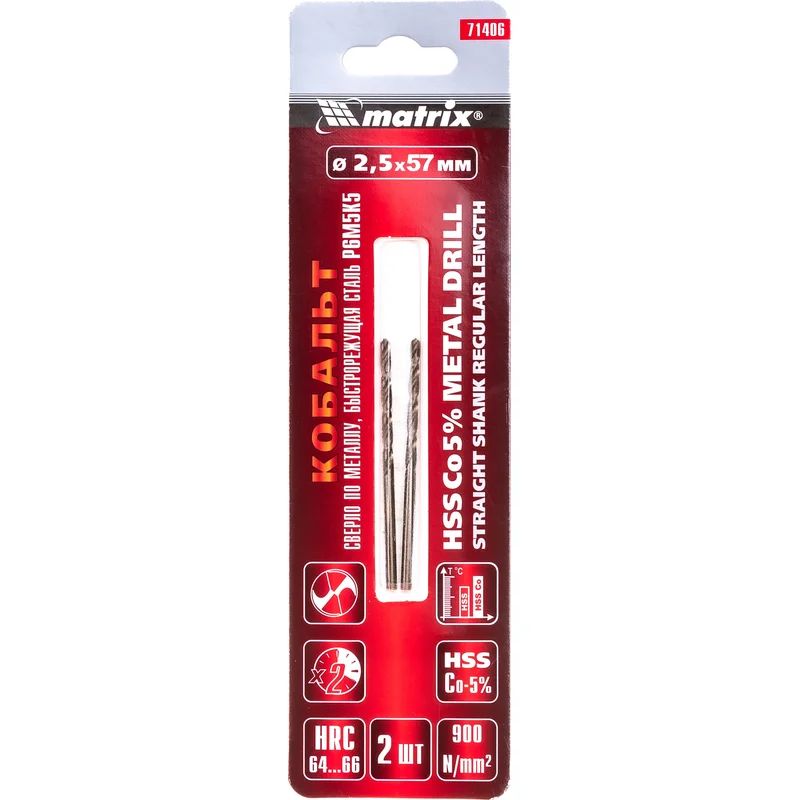 Сверло Matrix 71406 диаметром 2,5 мм, из стали HSS Co-5%, 2 шт. в комплекте, имеет угол заточки 135 градусов, оптимальный для сверления легированных и цветных металлов. Подходит для профессионального использования на строительной площадке.