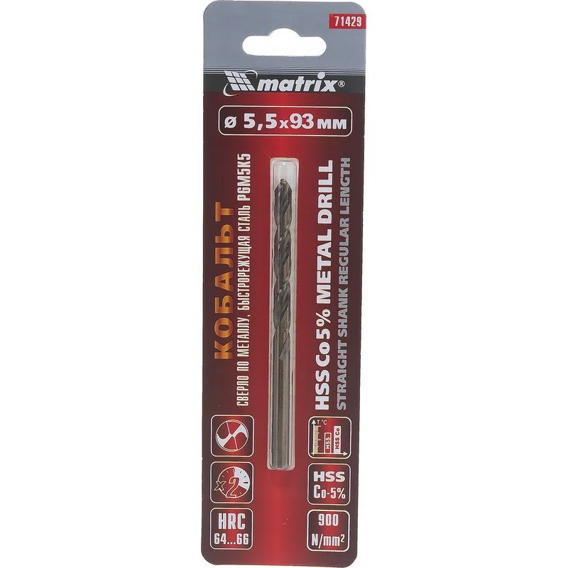 Сверло Matrix 71429 диаметром 5,5 мм, из стали HSS Co-5%, имеет угол заточки 135 градусов, оптимальный для сверления легированных и цветных металлов. Подходит для профессионального использования на строительной площадке.