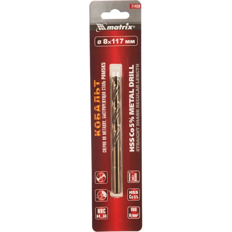 Сверло Matrix диаметром 8 мм, из стали HSS Co-5%, имеет угол заточки 135 градусов, оптимальный для сверления легированных и цветных металлов. Подходит для профессионального использования на строительной площадке.