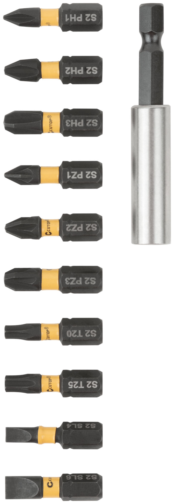 Торсионных бит 25 мм 10 шт: PH1, PH2, PH3, PZ1, PZ2, PZ3, T20, Т25, SL4, SL6. Адаптер для бит, с магнитным держ-лем 1 шт.