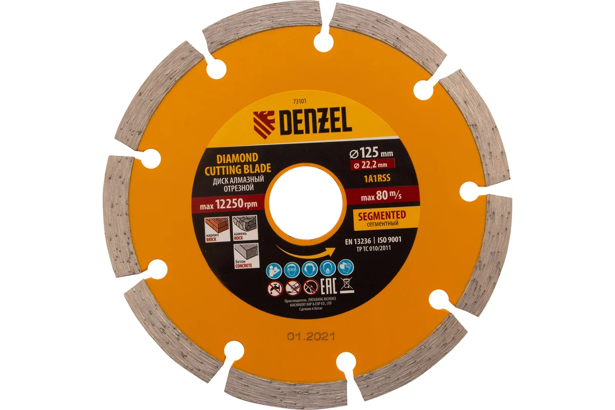 Отрезной сегментный алмазный диск Denzel 73101 диаметром 125 х 22,2 мм — оснастка для УШМ, использующаяся для сухой резки свежего и старого бетона, камня, кирпича, шлакоблока, мрамора, тротуарной плитки, гранита. Диск сегментного типа отличается высокой производительностью даже при интенсивных нагрузках. Подходит для бытового и профессионального использования.