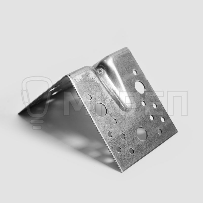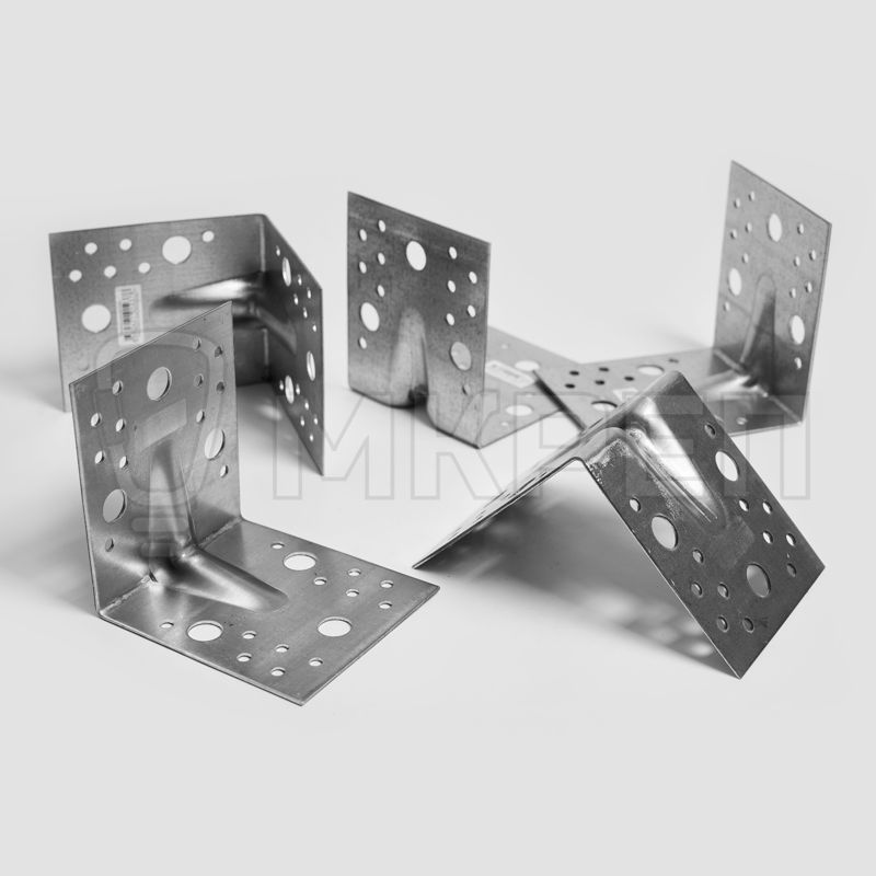 Уголок крепёжный усиленный KUU — металлическая пластина, согнутая под прямым углом. По центру проходит ребро жесткости. На обоих плечах (сторонах уголка) есть отверстия круглой формы.