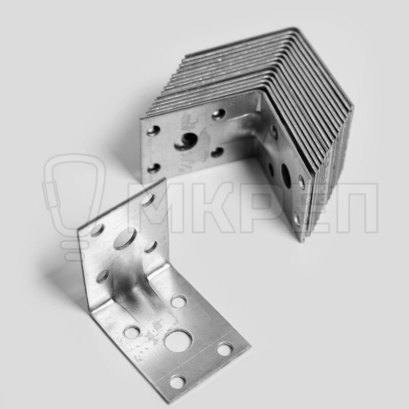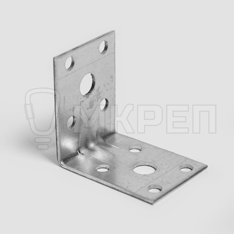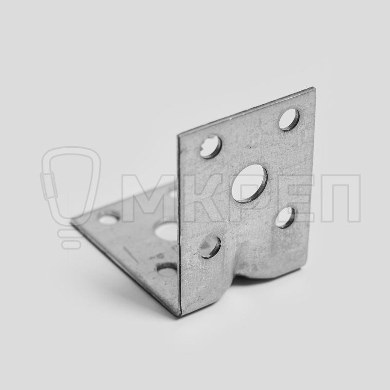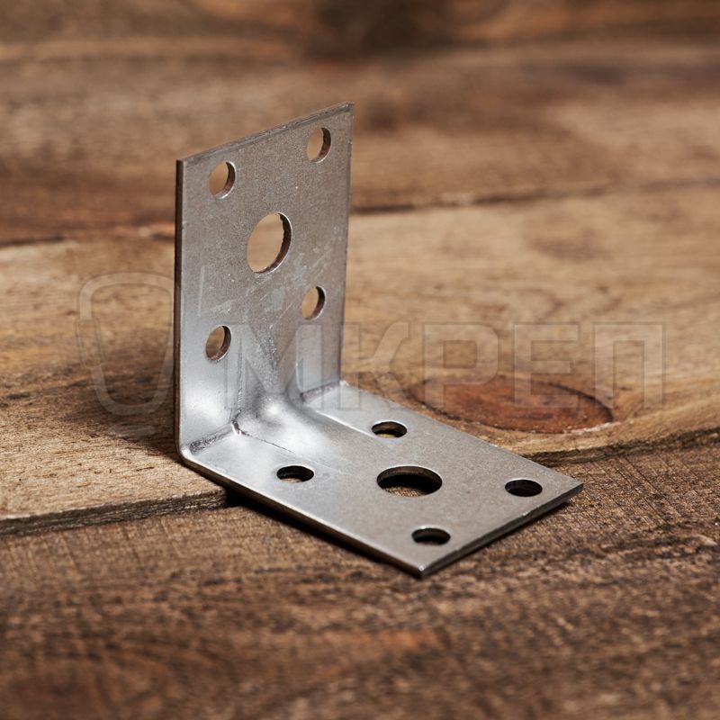 Уголок крепёжный усиленный KUU — металлическая пластина, согнутая под прямым углом. По центру проходит ребро жесткости. На обоих плечах (сторонах уголка) есть отверстия круглой формы.