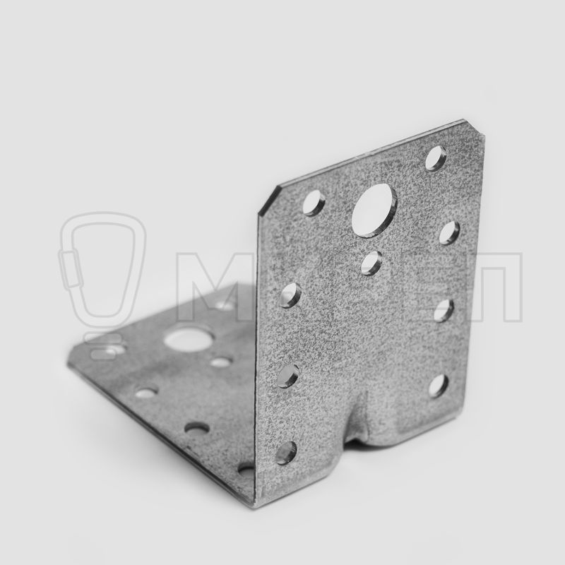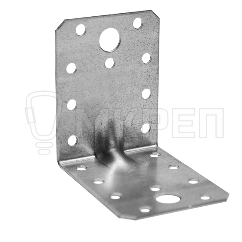 Уголок крепёжный усиленный KUU — металлическая пластина, согнутая под прямым углом. По центру проходит ребро жесткости. На обоих плечах (сторонах уголка) есть отверстия круглой формы.